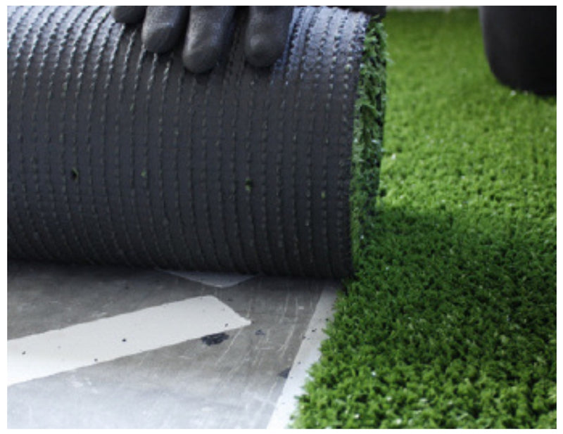 A seguir, levanta as laterais dos rolos e põe cola no chão. Baixa gradualmente as laterais para fixares a relva ao chão.