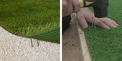 Para fixares melhor toda a relva, coloca grampos no perímetro do pavimento, a cada 30 centímetros.