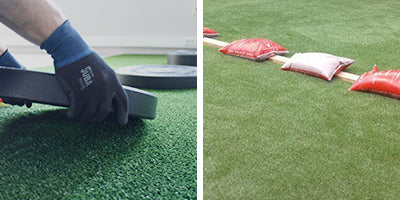 Dispõe coisas pesadas em cima de todas as juntas durante 24 horas para garantires uma aderência total da relva à base.