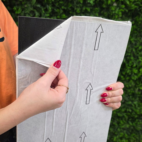 Retira a proteção de papel da face autoadesiva do pavimento e cola-o à base. Começa pelo canto da divisão.