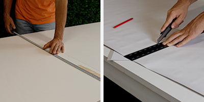 Mede a área a revestir e transfere as medidas para o rolo. Corta com 1 a 2 cm de margem extra.